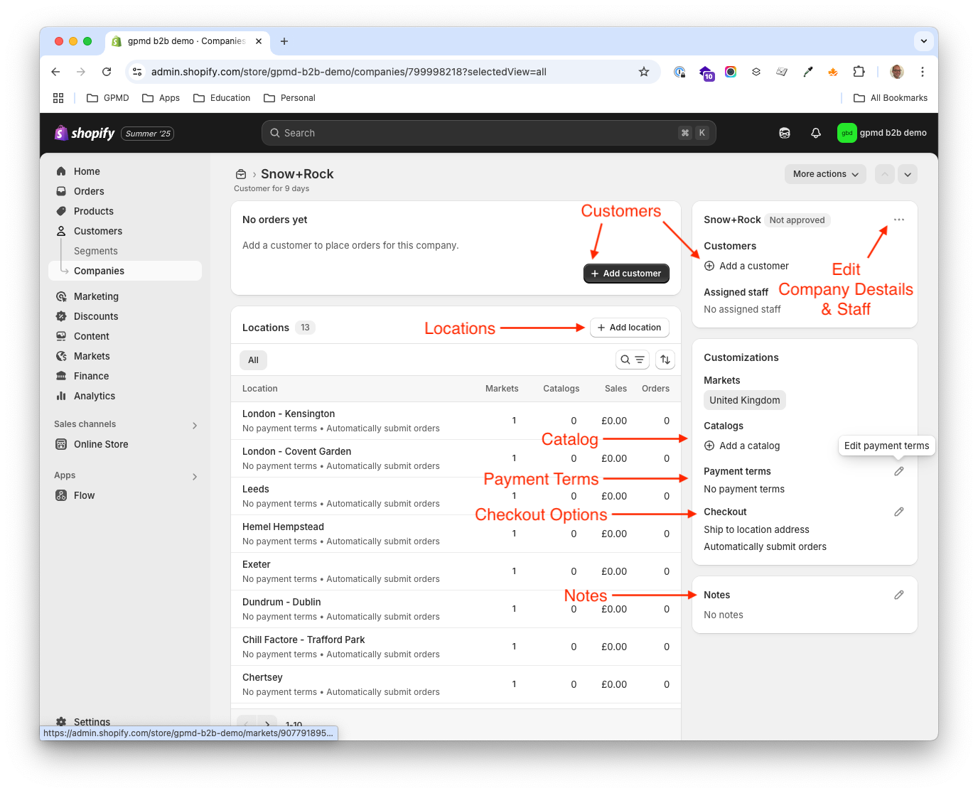 Shopify B2B adds two key entitles that provide the foundation for the b2b feature set; Companies and Locations.