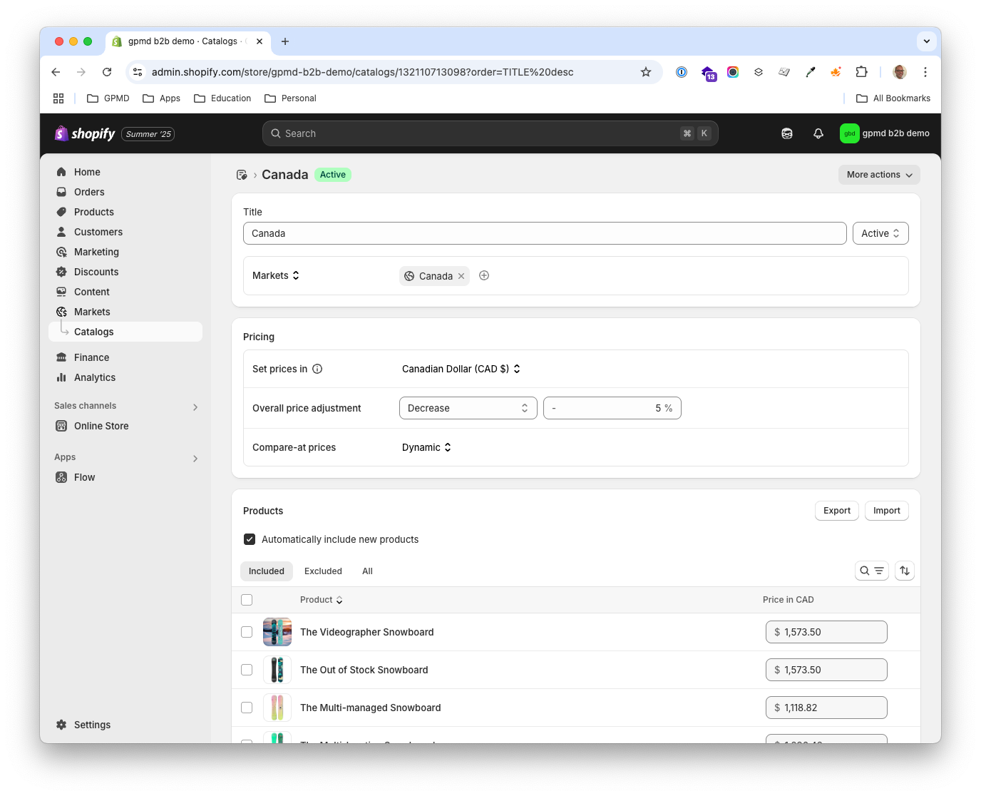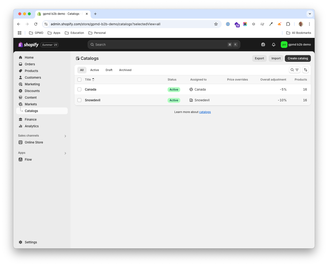 The third key part of Shopify B2B is catalogs. This allows you to create a specific view your product catalog and assign it to a Company or Location (You can also assign a catalog to a market), allowing you to create individual products catalogs and/or prices. Access is through Markets > Catalogs, here you can add & edit Catalogs and control the following settings