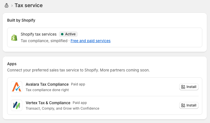The setup for both of these is under Settings > Taxes and duties in the Shopify admin foreach region you operate in you will need to select which tax service you want to use