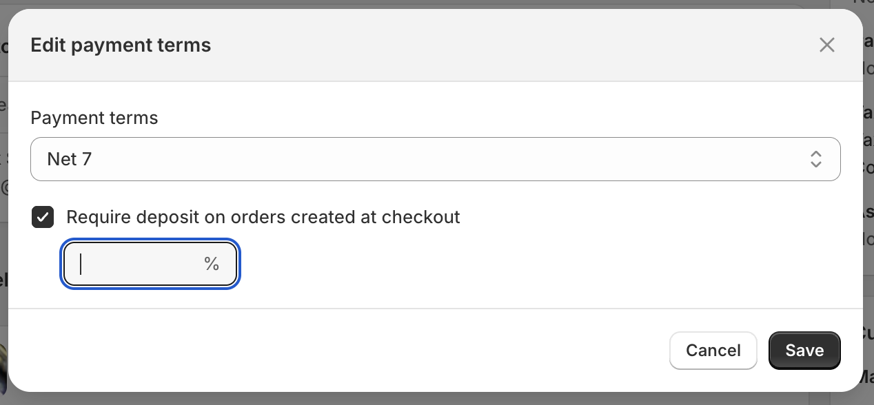 The payment terms feature allows you to give you customers specific terms for payment, Shopify also gives you the option to require a deposit so you can request part payment when an order is placed. Access to payment terms is through Customers > Companies here you can edit the payment terms for either a Company or a Location: